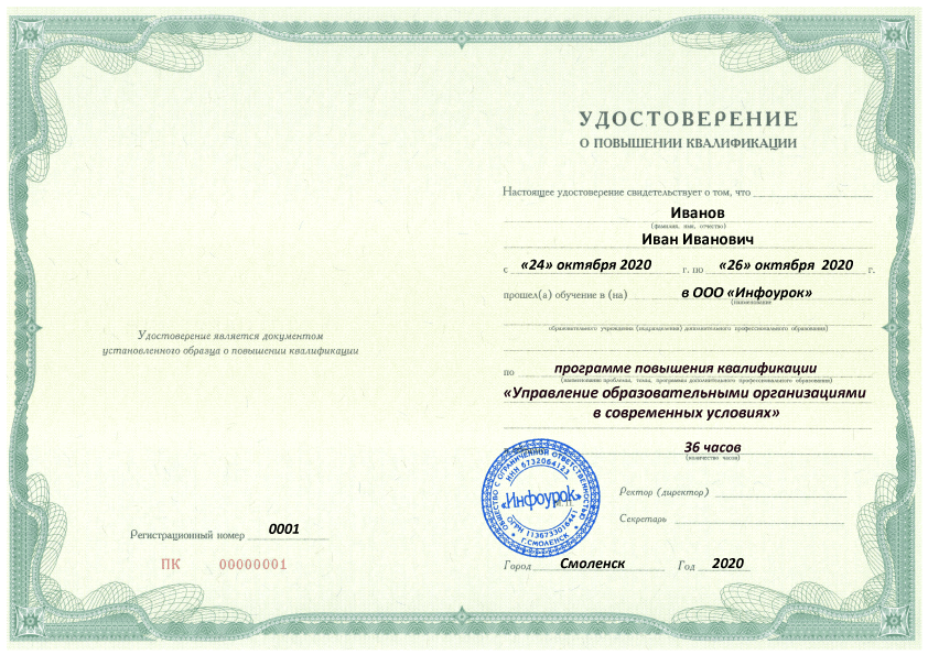 Удостоверение о повышении квалификации «Управление образовательными организациями в современных условиях» (выдаётся только при успешном прохождении итоговой аттестации)