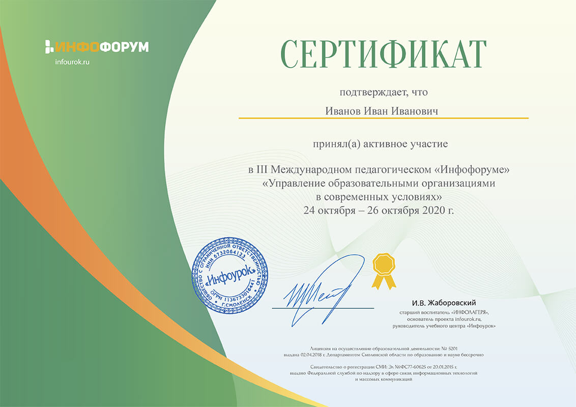 Сертификат участника III Международного педагогического «Инфофорума» «Управление образовательными организациями в современных условиях»