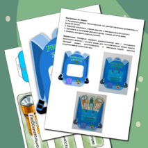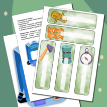 Рюкзачок двусторонний (имеет переднюю и заднюю часть). Необходимо распечатать, вырезать и склеить части между собой. Обе стороны функциональны. Имеют по кармашку с каждой стороны. Кармашки приклеиваются к обозначенным местам. В маленький кармашек передней части можно складывать необходимые экологу предметы для изучения природы (фонарик, карта, фотоаппарат и прочее). В большой кармашек задней части складываются карточки с важными качествами эколога. Рюкзачок можно обклеить значками с правилами поведения человека в природе.